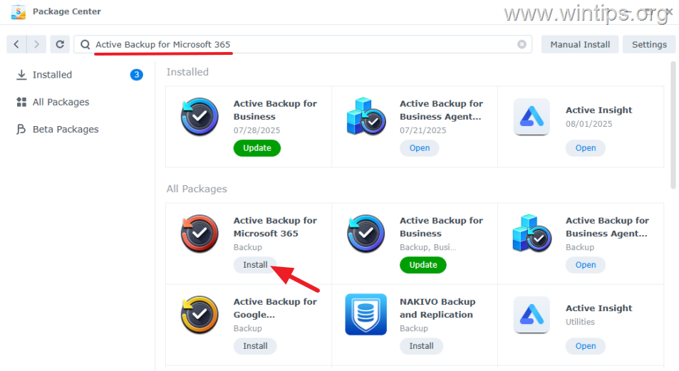 1. In your Synology's DSM, open Package Center and search for "Active Backup for Microsoft 365".