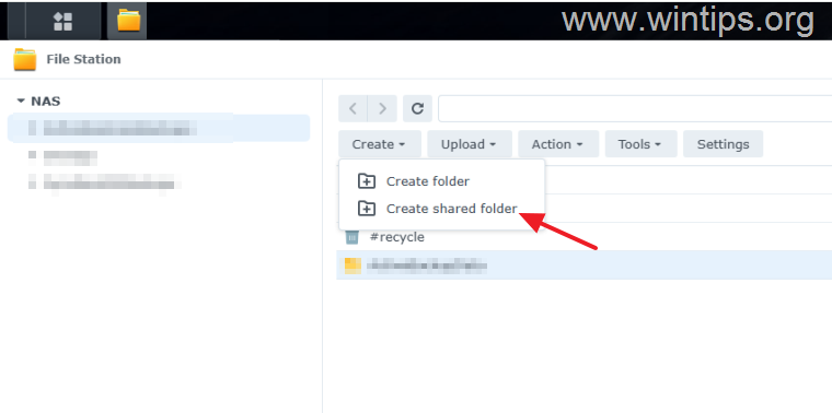 1. On your Synology's DSM, open File Station and choose Create > Create Shared folder.