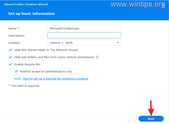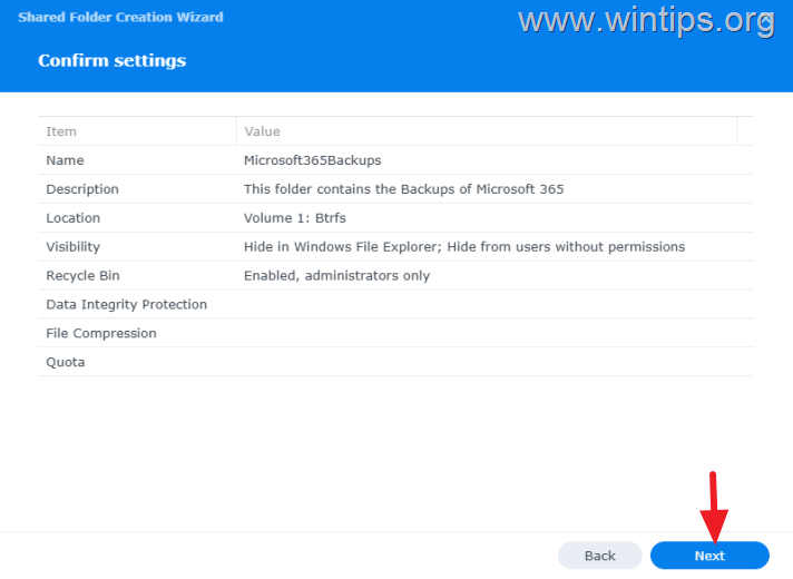 2. Type a name for the new shared folder (e.g. "Microsoft365Backups") and then change the folder settings below according your needs. Then, click Next.