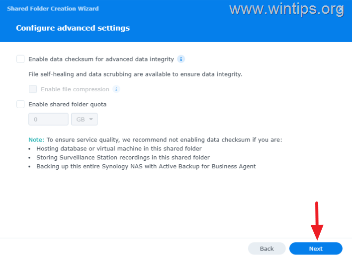 4. Now modify (if you want), the advanced settings of the shared folder and click Next.