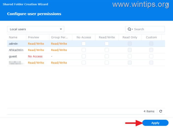 6. Finally, specify the user permissions and click Apply. Then continue to next step.