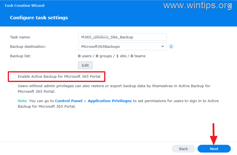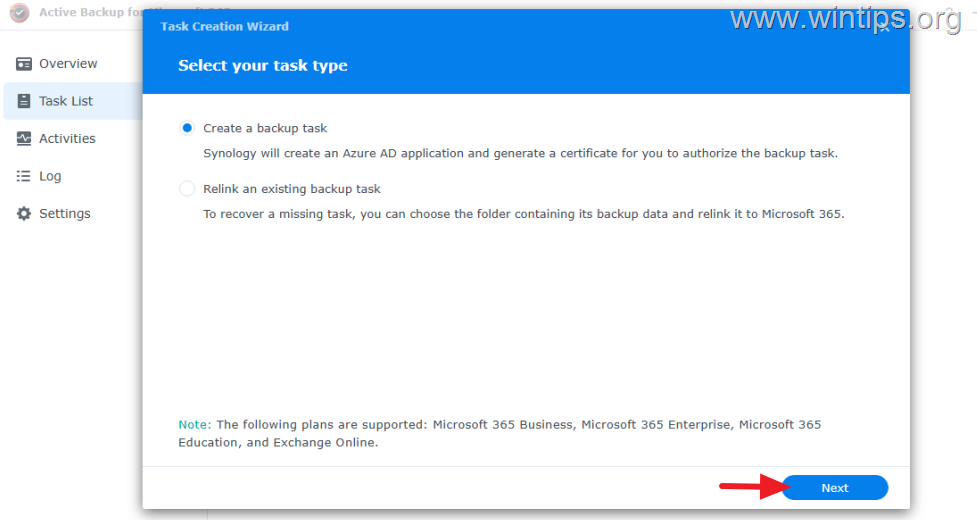 1. Open Active Backup for Microsoft 365 and click Next to Create a backup task.