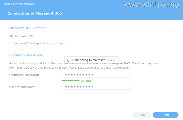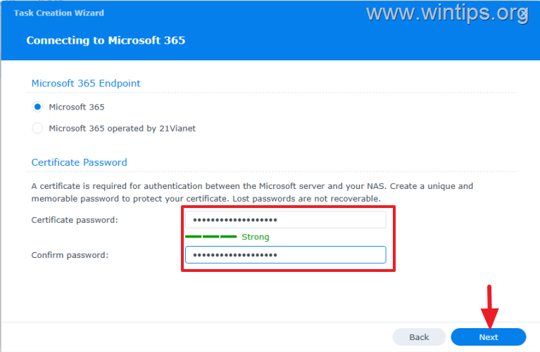 2. Now select the Microsoft 365 endpoint type, then enter a very strong password for the certificate that will be used to authenticate your Microsoft endpoint with your NAS. When done, click Next.