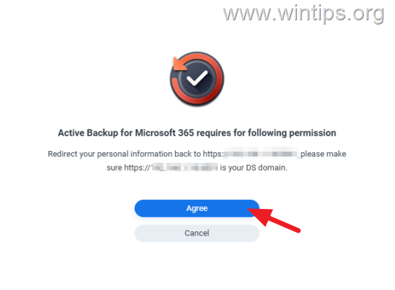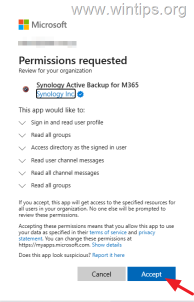 4. On the next screen Accept the read and access permissions requested by Synology Active Backup for M365.