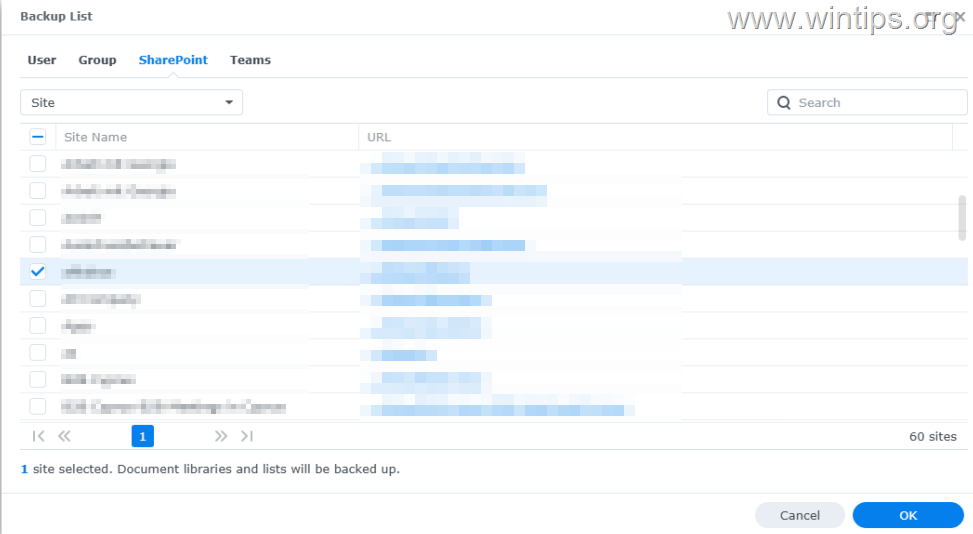 3a. In the Backup List options, you will see that by default, all Users, Groups, SharePoint Sites, and Teams data will be backed up. If you do not want this, go to all tabs and select only the data you want to back up. (e.g. in this guide we have chosen to back up only a specific SharePoint site). When you are finished, click OK to continue.