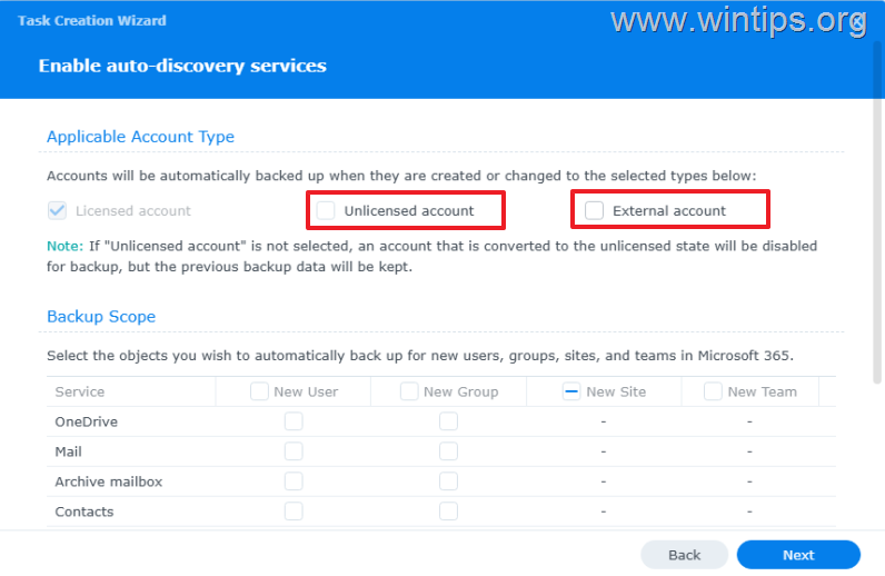 In the Applicable Account Type: choose whether to back up data in unlicensed and external accounts.