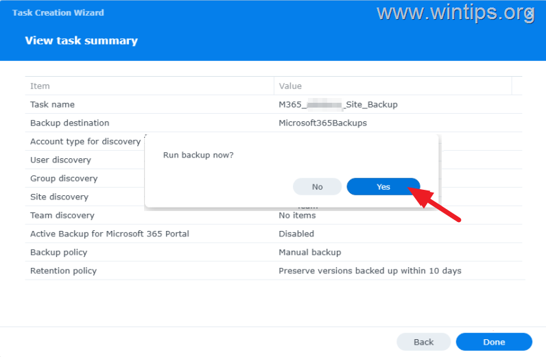 12. Now, you'll be asked if you want to back up now. If so, click Yes to create the first backup of your selected Microsoft 365 data.